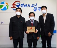 경북사회복지공동모금회(회장 전우헌)가 지난 24일 칠곡군청을 방문해 2020년 ‘The Best 착한일터’ 상패를 전달했다.착한일터 캠페인은 직장 1곳당 5명 이상의 직장인들이 매달 5천 원 이상을 기부하는 사회복지공동모금회의 정기기부 프로그램이다.칠곡군청이 선정된 ‘