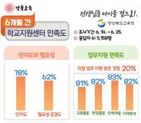 경북교육청(교육감 임종식)은 도내 각급 학교 교직원을 대상으로 실시한 23개 교육지원청 학교지원센터 업무지원 만족도 조사 결과 만족도가 82%로 업무지원에 대해 높은 만족도를 보였다고 9일 밝혔다. 경북교육청은 ‘선생님을 아이들 곁으로!’라는 비전으로 교사가 수업과 생