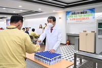 김충섭 김천시장은 30일 코로나19로 힘든 상황속에서도 최선을 다하고 있는 직원들의 노고를 격려하기 위해 시청 구내식당에서 직접 배식 봉사를 가졌다. 이날 김 시장은 하얀 위생복을 입고 점심 식사를 위해 구내식당을 찾은 직원들에게 일일이 웃는 얼굴로 유산균 음료를 배식