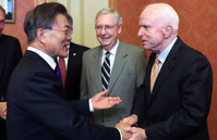 문재인 대통령이 지난 5월 면담 일정 조율 실패로 방한이 무산돼 '홀대설'을 야기했던 존 매케인 상원의원과의 만남을 따로 챙겼다.상원지도부 간담회에서 만났지만, 공화당의 대선후보를 지내는 등 영향력이 큰 정치인이라는 점을 감안해 정상회담을 마친 뒤 별도로 시간을 낸 것