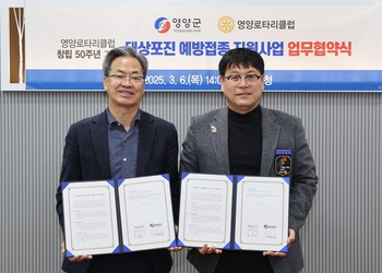 영양군(군수 오도창)은 지난 6일 군청 소회의실에서 ‘영양군민 대상포진 예방접종 지원사업’을 추진하기 위해 국제로타리클럽3630지구 영양로타리클럽(회장 김종호)과 업무협약을 맺었다고 밝혔다.‘영양군민 대상포진 예방접종 지원사업’은 영양로타리클럽 창립 50주년에 따른 기