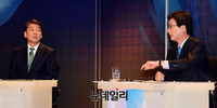 문재인 민주당 대선후보와 안철수 국민의당 대선후보가 13일 첫 대선후보 TV 토론에서 '정치적 통합'을 놓고 신경전을 펼쳤다. 두 후보가 정치적 통합의 일환인 '적폐세력 지지'를 놓고 대립각을 세운 것이다. 이날 토론은 SBS 공개홀에서 열렸다.포문은 안 후보가 열었