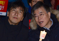 더불어민주당 대선 경선 레이스를 펼치는 두 주자 문재인 전 대표와 안희정 충남지사가 18일 밤 서울 광화문 광장에서 열린 16차 촛불집회에 참석했다. 공교롭게도 두 후보의 이번 만남은 민주당 경선지형이 '양강 구도(문재인-안희정)'로 형성된 후 처음 마주한 자리다.