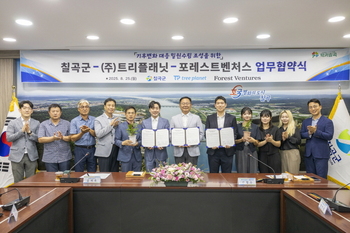 경북 칠곡군은 양봉사업체인 트리플래닛, 포레스트벤처스(대표 김형수)와 기후변화에 대응한 꿀벌 수분수인 밀원수림 조성을 위한 업무협약(사진)을 체결했다고 29일 밝혔다.이번 협약은 양봉특구 칠곡군의 양봉산업 발전기반을 확보하기 위해 군유림과 유휴부지에 꿀벌의 먹이인 밀원