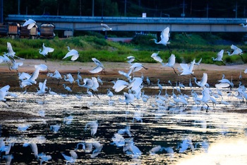 울진군 남대천, 여름 햇살 아래 백로들이 하얀 군무로 하늘을 수놓는다.청정한 자연 속에서 철새들이 머무는 울진의 풍경은 군민들과 방문객들에게 특별한 선물이 되고 있다.