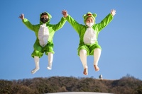 “잠에서 깨어난 개구리처럼 마음껏 뛰어놀고 싶어요.”개구리도 잠에서 깬다는 경칩을 이틀 앞둔 3일 정태호(7)·김나희(6) 어린이가 칠곡보 사계절 썰매장 ‘뜀동산’에서 개구리 인형 옷을 입고 하늘을 향해 도약하며 환한 웃음꽃을 지었다. 김 양은 “코로나로 유치원에서 친