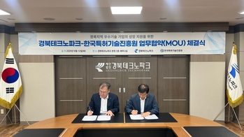 (재)경북테크노파크(원장 하인성)는 지난 12일 11시 경북TP 본원에서 한국특허기술진흥원과 경상북도 우수기술 기업의 국내외 지식재산 경쟁력 강화를 위한 업무협약(MOU)을 체결했다. 이번 협약의 주요 목적은 경북기업의 기술사업화 전주기에서 특허정보