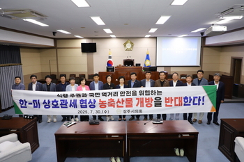 경북 상주시의회는 30일 한미 통상협상에서 농축산물 수입 확대를 제시한다는 방침에 강력히 반대한다는 성명을 발표했다.상주시의회는 성명에서 미국이 관세 인하를 조건으로 미국산 소고기와 사과 등 농축산물시장 추가 개방을 요구하는 것에 대해 산불 피해, 기후 재난, 전염병