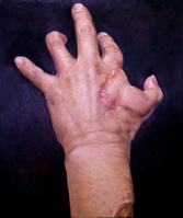 서해 수호의 날을 하루 앞둔 25일 경북 칠곡군청에 특별한 그림이 전달돼 주목된다. 칠곡군 가산면에서 갤러리 쿤스트를 운영하는 김기환(52) 서양화가의 작품 ‘움직이지 않는 손가락’이다.2002년 제2연평해전 당시 부상을 당한 권기형 상병의 왼손을 가로 60cm, 세로