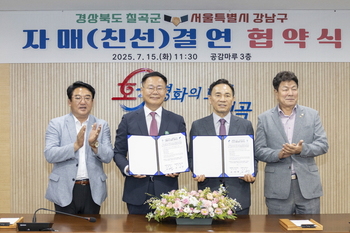 경북 칠곡군은 16일 군청에서 김재욱 군수와 조성영 서울 강남구청장을 비롯한 관계자 50여 명이 참석한 가운데 강남구와 자매결연 협약을 체결했다. 지매결연을 통해 양 자치단체는 교육·경제·문화·관광·행정 등 다양한 분야에서 상호 협력과 교