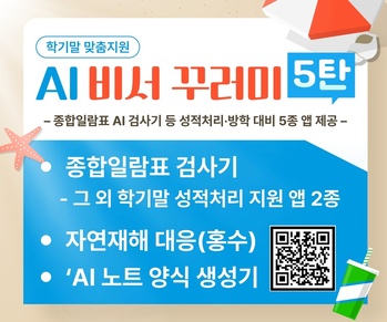 경북교육청(교육감 임종식)은 학기 말 성적 처리와 방학 대비 업무를 인공지능으로 지원하는 웹앱 패키지 ‘AI 비서 꾸러미 5탄(학기 말 맞춤 지원 꾸러미)’을 전국 최초로 개발해 보급했다.16일 경북교육청에 따르면 이번 꾸러미는 교사들이 매 학기 반복적으로 수행해야 하