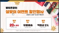 영천시(시장 최기문)는 민족 대명절 설을 맞아 영천시 농특산물 쇼핑몰인 ‘별빛촌 장터’에서 설맞이 이벤트 할인행사를 실시한다. 이번 행사는 설 대목을 앞둔 1월 20일부터 2월 5일까지 17일간 입점 상품 20% 할인과 무료 배송, 회원 구매 시 구매금액의 5
