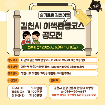 경북 김천시는 김천관광의 매력을 알리고, 참신한 아이디어를 발굴하기 위해 ‘김천시 이색관광코스 공모전’을 개최한다고 30일 밝혔다.이번 공모전은 김천을 찾는 관광객들에게 새로운 경험을 제공할수 있는는 코스를 발굴해 관광을 활성화 하기 위해 시행한다. 김천시는
