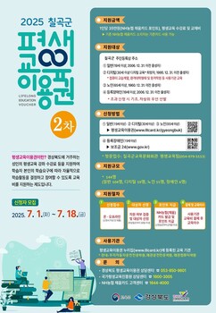 경북 칠곡군은 7월1일부터 7월18일까지 ‘평생교육이용권’ 2차 지원자를 모집한다.평생교육이용권은 학습격차를 줄이고 다양한 교육 프로그램에 참여하는 수강료와 교재비를 지원하는 것으로, 지난 5월 1차 모집에서는 기초생활수급자·차상위계층·등록장애인을 중심으로 선정한 바