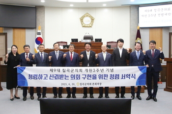 경북 칠곡군의회(의장 이상승)는 30일 의원과 사무국 직원을 대상으로 청렴 서약식을 가졌다. 서약식은 제9대 칠곡군의회 개원 3주년을 맞아 그동안의 의정활동을 되돌아보고, 공직자의 기본 책무인 청렴의 가치를 일깨우기 위해 시행했다. 서약식에