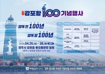 경주시(시장 주낙영)가 감포항 지정 100주년을 맞아 오는 25일부터 28일까지 나흘간 감포읍 용오름광장 일원에서 ‘감포항 100년 기념행사’를 개최한다고 밝혔다.‘함께한 100년, 함께할 100년’을 주제로, 감포항의 역사적 가치를 재조명하고 미래 해양관광 거점으로의