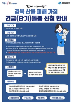경상북도는 3월 경북 북부지역에서 발생한 대규모 산불로 돌봄 공백이 발생한 피해 가정을 지원하기 위해 4월 한 달 ‘아이돌봄 서비스 특별지원대책’을 마련한다.이번 지원은 안동, 의성, 청송, 영양, 영덕 등 특별재난지역으로 선포된 5개 시군 내 피해 가정을 대상으로 하