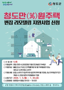 청도군(군수 김하수)은 매년 증가하는 빈집 문제를 해소하고, 월 1만 원의 임대료로 주거비 부담을 완화하는 동시에 생활 인구 유입을 촉진하기 위해 2026년도 청도만(萬)원주택사업을 확대 시행한다고 밝혔다. 빈집 리모델링 지원사업인 ‘청도만(萬)원주택사업’은