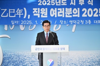 김광열 영덕군수가 2일 청사 대회의실에서 열린 2025년 시무식에서 올해 6대 역점과제를 실현해 지방소멸을 막고 지역의 지속 가능한 성장을 이룩하겠다는 포부를 밝혔다.먼저 김 군수는 지난해를 돌아보며 △경북 제1호 ‘K-웰니스 도시’ 선정 △생활인구 2분기 도내 1위