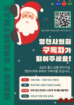 영천시의회(의장 김선태)가 시민과의 소통을 강화하고 의정활동에 대한 관심을 높이기 위해 6일부터 15일까지 10일간 유튜브 구독 이벤트를 실시한다.이번 이벤트는 유튜브라는 대중적인 소통 채널을 활용해 의회 소식을 더 가까이 전해 시민과의 공감대를 형성하기 위해 마련했다