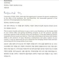 지난 10월 4일 경북도청을 방문해 ‘인도의 미래 발전상’을 주제로 도청 공무원 및 유관 기관장 등을 대상으로 강연을 한 인도 델리대학교의 요게쉬 싱(Yogesh Singh) 부총장이 이철우 도지사에게 감사 서한문을 보내왔다.델리대학교와 경상북도의 인연은 지난 5월로