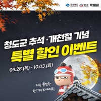 청도군(군수 김하수)은 경북 공공배달앱 ‘먹깨비’ 이용 활성화를 위해 추석 및 개천절 연휴기간인 오는 9월 28일부터 10월 3일까지 6일간 특별 할인 이벤트에 나선다.이벤트 기간에 ‘먹깨비’ 앱에서 1만5000원 이상 주문 시 선착순 500명에게 4000원 할인쿠폰이