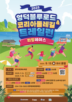 (재)영덕문화관광재단(이하 재단)은 오는 13일 대진해수욕장과 관어대 등 블루로드 일원에서 제1회 영덕블루로드&코리아둘레길 트레일런 희망레이스를 개최한다고 밝혔다.문화체육관광부, 경상북도, 영덕군이 주최하고 영덕문화관광재단이 주관하는 이번 대회는 지난 3월 대형
