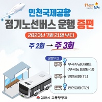 김천시(시장 김충섭)는 기존 왕복 2회 운행 중이던 김천~인천국제공항 버스가 오는 7월 21일부터 왕복 3회로 증편 운행한다고 18일 밝혔다.㈜코리아와이드진안고속에서 운행하는 인천국제공항 정기노선 버스는 대구 북부정류장을 출발해 구미와 김천을 거쳐 인천공항 1·2터미널