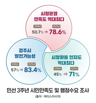 경주시민 10명 중 8명 가까이(78.6%)가 민선 8기 주낙영 경주시장의 시정 운영에 대해 ‘만족한다’고 답한 것으로 나타났다.경주시는 전문 여론조사기관 에이스리서치에 의뢰해 지난달 4일부터 11일까지 시민만족도 및 행정수요 조사를 진행했다.이번 조사는 경주에 거주하