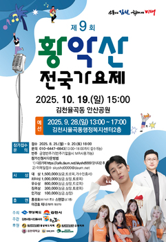 경북 김천시가 신인 가수 발굴과 시민들의 문화예술 향유 기회 확대를 위해 제9회 황악산 전국 가요제를 개최한다고 3일 밝혔다.이번 가요제는 국민 누구나 참가할 수 있으며 9월 28일 율곡동 행정복지센터에서 예선을 갖고 본선 진출자 14명을 선발한다.본선은 율곡동 안산공