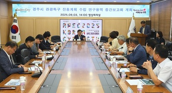 경주시(시장 주낙영)는 3일 시청 영상회의실에서 ‘경주시 관광특구 진흥계획 수립 연구용역 중간보고회’를 개최하고, 2025 APEC 정상회의 개최에 발맞춘 글로벌 관광도시 도약을 위한 전략 마련에 나섰다.이날 보고회에는 송호준 경주시 부시장을 비롯해 시의회 의원, 관광