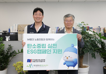 전국금융산업노동조합 iM뱅크대구은행지부(위원장 백지노)는 8일 수성동 본점에서 ‘탄소중립 실천 캠페인-1.5도 라이프 스타일로 한 달 살기’ 교육의 원활한 진행을 위한 후원금을 전달했다이번 교육은 대구광역시환경교육센터(이사장 권덕기) 주최로 청년, 시민, 취약계층을 대