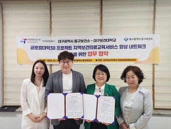 글로컬대학 대구보건대학교(총장 남성희) 한달빛공유협업센터는 11일 중구보건소 소장실에서 대구 중구보건소와 ‘지역보건의료교육서비스 향상 네트워크 구축을 위한 업무협약’을 맺었다고 밝혔다.이번 협약은 건강취약계층의 보건의료 교육 지원과 지역사회 상생을 목표로, 협력을 통한