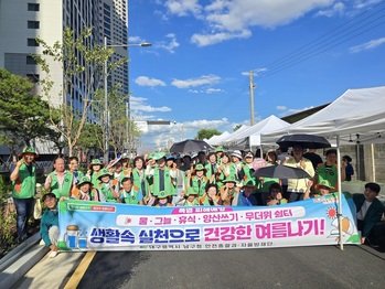 대구 남구는 자율방재단원들과 함께 여름철 더위에 지친 남구 주민들을 위해 얼음 생수 나눔을 통한 폭염 행동 요령 홍보를 실시했다.대구 남구는 지난 1일 남구민 한마음대회와 연계하여 대명 힐스테이트 1차 아파트 인근에서 ‘여름철 폭염대비 얼음 생수 및 부채 나눔 캠페인’
