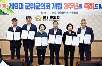 군위군의회(의장 최규종)는 1일 개원 3주년을 맞아 ‘반부패·청렴 실천 서약식’을 열고 청렴하고 공정한 의정활동을 실천하겠다는 의지를 밝혔다.이날 서약식에서는 최규종 의장을 비롯한 의원들과 의회사무과 직원들이 함께 참석해, 법과 원칙을 준수하고 공익을 최우선으로 하는
