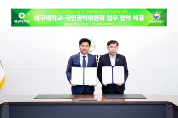 대구대학교(총장 박순진)와 국민권익위원회(위원장 유철환)가 청렴한 미래인재 양성과 장애 학생 등 권익 보호를 위해 손잡았다.대구대는 지난 6월 27일 경산캠퍼스 성산홀(본관) 2층 대회의실에서 박순진 총장, 유철환 국민권익위원회 위원장 등 주요 인사가 참석한 가운데 청