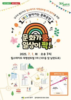 대구 남구는 오는 7월 1일 힐스테이트 대명센트럴 1차 아파트에서 주민들을 위한 ‘2025 찾아가는 음악회’를 개최한다.대구 남구는 주민의 일상 속 문화 향유 기회를 확대하고 지역 예술가들의 수준 높은 공연 활동을 지원하기 위해 남구 문화예술 부문 정책 사업인 ‘202