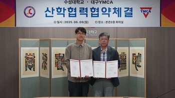 수성대학교(총장 김선순)는 청소년사업 사회교육 국제교류등의 사업을 운영하고 있는 시민단체인 대구YMCA(이사장 이충기)와 9일 본관2층 회의실에서 산학협력협약을 맺었다.강성수 수성대 산학협력단장과 오병현 대구YMCA기획실장등이 참여한 가운데 양측은 지역사회 발전을 위한