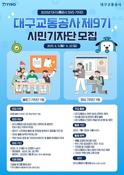 대구교통공사는 블로그·페이스북·유튜브·인스타그램 등 공사 SNS를 통해 도시철도와 관련한 다양한 소식을 전할 ‘제9기 DTRO 시민기자단’을 모집한다.인원은 블로그 기자단 7명, 영상 기자단 7명으로 총 14명이고, 기간은 6월 9일부터 6월 22일까지다.우리 공사에
