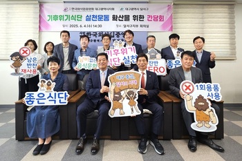 대구 달서구(구청장 이태훈)는 (사)한국외식업중앙회 대구광역시지회장 및 9개 구·군 지부장과 간담회를 개최하고, ‘기후위기식단 실천운동’의 대구시 전역 확산을 위한 공동 협력 방안을 논의했다고 6일 밝혔다.‘기후위기식단 실천운동’은 급격한 기후변화와 지구온난화의 주요