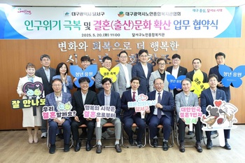대구 달서구(구청장 이태훈)는 대구광역시노인종합복지관협회와 초저출생 인구위기 극복을 위한 업무협약을 맺고, 지역사회와의 공동 대응 체계를 강화했다고 25일 밝혔다.이번 협약은 달서구노인종합복지관에서 진행되었으며, 협회 소속 21개 노인복지관장 및 임원 40여 명이 참석