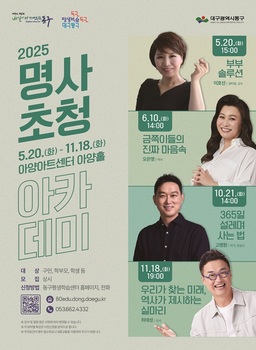 올해도 명사초청 아카데미가 구민들을 찾아간다.대구 동구청(구청장 윤석준)은 2025년 명사초청 아카데미 라인업을 확정하고, 5월부터 11월까지 총 4회 운영에 들어간다. 특히, 올해는 강사 라인업이 화려하다. 20일에 진행되는 첫 강의는 최근 인기리에 방영되고