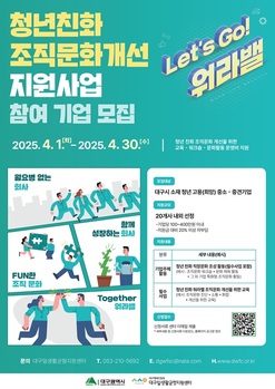 대구행복진흥사회서비스원(이사장 배기철, 이하 대구행복진흥원)이 청년이 정착할 수 있는 워라밸(Work-Life Balance) 기업 환경 조성을 위해 ‘청년 정착 워라밸 기업문화 조성 사업’을 펼친다.이에 따라 ‘청년친화 조직문화개선 기업’을 1일부터 공개 모집한다.이