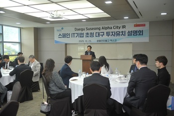 대구경북경제자유구역청(청장 김병삼, 이하 DGFEZ)은 10월 23일 오전 11시, 호텔인터불고 EXCO에서 주한스페인상공회의소(회장 Roger Royo, 이하 ESCCK)와 공동으로 스페인 IT기업을 초청한 대구 투자유치 설명회를 개최했다.‘스페인 IT기업 초청 대구