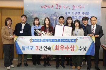 대구 달서구(구청장 이태훈)는 ‘2025년도 대구시 청소년 선도·보호 우수시책 구·군 평가’에서 3년 연속 최우수 기관으로 선정됐다.이번 수상은 앞서 여성가족부 주관 청소년정책 우수 지자체 분석 평가에서 국무총리상을 수상한 데 이은 성과로, 청소년을 향한 달서구의 지속