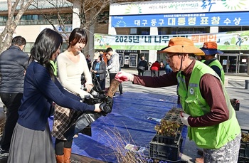 제80회 식목일을 앞두고 14일, 구청 열린마당과 율하체육공원 일대에서 진행된 ‘내 나무 갖기 캠페인’이 조기에 마감되는 등 큰 호응을 얻었다.오전 9시부터 개최된 이날 행사에는 등나무, 괴불나무, 로즈마리, 매실나무 등 묘목 13종 2910그루를 준비했는데, 시작과