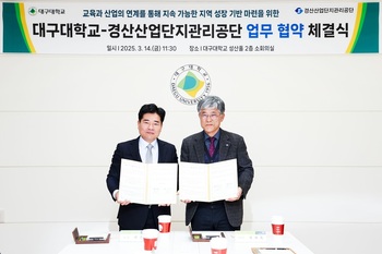 대구대학교(총장 박순진)와 경산산업단지관리공단(이사장 권재득)이 지역 산업체 수요에 맞는 전문 인력 양성을 위해 함께 힘쓴다.대구대는 지난 3월 14일 경산캠퍼스 성산홀 2층 대회의실에서 박순진 대구대 총장, 권재득 경산산업단지관리공단 이사장 등 양 기관의 주요 인사가