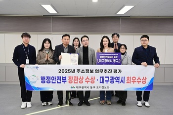 대구 동구청(구청장 윤석준)은 행정안전부가 주관하는 ‘2025년 주소정책 업무추진 평가’에서 행정안전부 장관 표창을 수상했다. 행정안전부 평가는 전국 광역 및 기초 자치단체를 대상으로 주소 정보 홍보 및 교육, 주소정보 시설물 점검 및 조치, 정책 협력 등 주