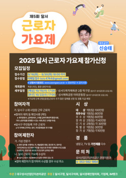대구 달서구(구청장 이태훈)는 오는 22일 오후 4시, 성서산업단지 내 성서체육공원 야외운동장(월암동)에서 ‘제5회 달서 근로자 가요제’를 개최한다.가요제는 산업현장에서 땀 흘리는 근로자들을 위로하고 노사 상생과 지역경제 활력을 도모하는 지역 대표 근로자 문화축제다.이