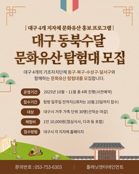 대구 수성구(구청장 김대권), 동구, 북구, 달서구가 협력해 지역의 역사와 문화를 함께 배우고 체험하는 ‘대구 문화유산 탐험대’ 운영을 시작한다.이번 사업은 대구 4개 기초자치단체가 협력하여 각 지역의 국가유산을 활용·홍보하고, 시민이 직접 체험하며 지역의 역사문화를